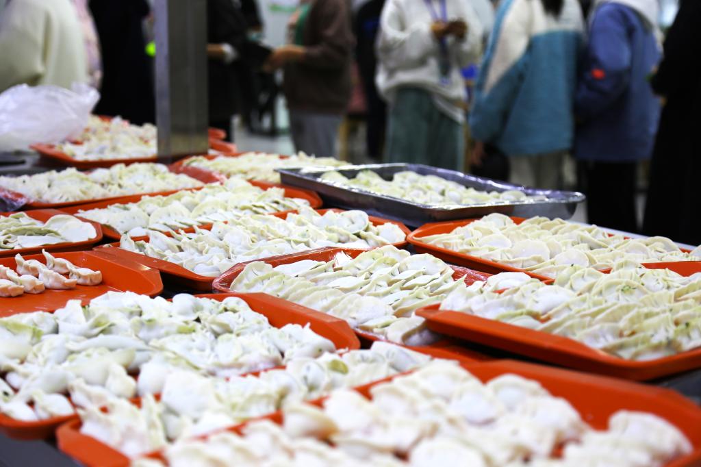 包饺子和煮饺子同时进行,很快第一锅饺子就出锅了,有白菜猪肉和韭菜猪肉两种馅料的饺子,大家都迫不及待品尝自己的成果。幸运的是,虽然大多数人是第一次包饺子,但是煮出来的效果很好,露馅的饺子少之又少。学校还准备了惊喜“红烧大排”,每个人一碗热乎乎的饺子上面盖着一块香喷喷的大排,“真的好好吃”、“好香啊”,空气中弥漫着满满的饺子香味。