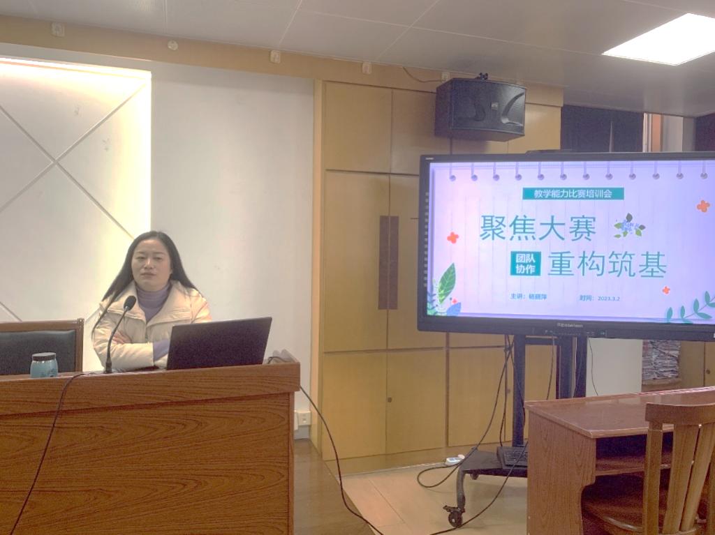 为进一步提升青年教师的教学能力与业务水平,促进教师快速成长,迎接第七届教学大赛,3月2日下午,校教务处在第四会议室召开了第七届教学大赛培训会。会议邀请了杨丽萍副校长、语文教研室主任缪文姬老师担任培训专家,参赛的各团队教师、2022年入职新教师及部分教研室主任参加了培训。