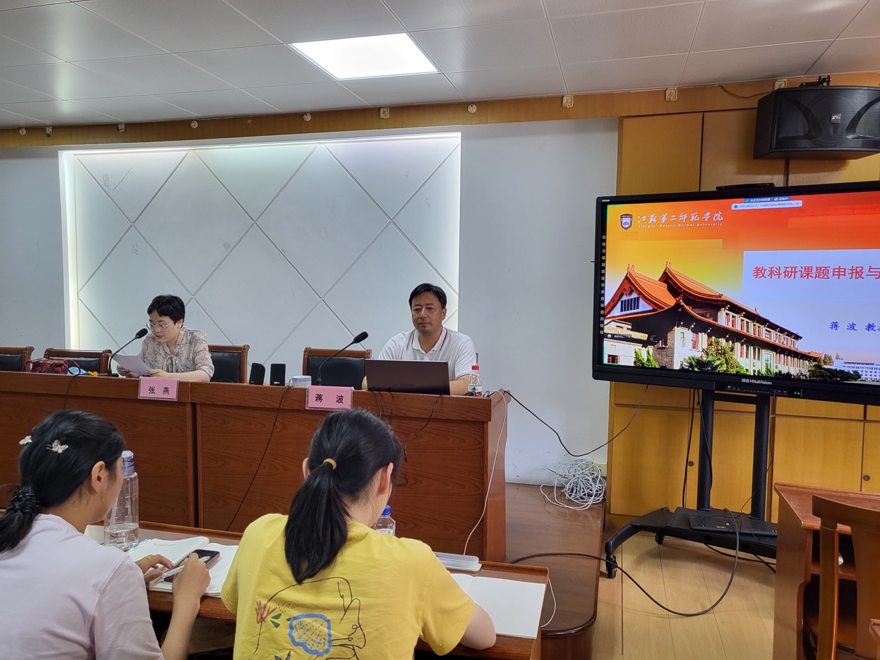 下午,学生处高柳莺副主任从自身工作经历出发,分享了宝贵的学生管理工作经验,并从德育特色、日常规范及奖惩制度等方面解说了学生管理规范要求。下午第二项培训由教科室张燕主任主持。江苏第二师范学院教育科学学院院长蒋波教授以“教科研课题申报与成果培育”为题,为新教师介绍了教科研课题申报与论文写作的方法技巧,并为在座教师展示了课题申报书。讲座结束后,蒋波教授就教师在教科研方面的问题解疑答惑。