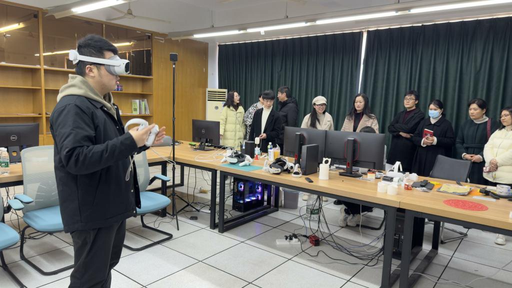 数字创意学院院长杨会及其领导班子成员带领杨校一行参观了党建工作室、VR专业实训室、“文纺雅造”牛仔布艺手作工作室、大学生创新创业训练中心等。VR专业实训室老师现场展示了“天问”航空主题VR实景作品的操作演示,让老师们身临其境地感受VR实景。接着,杨会院长就学院概况、专业建设、师资队伍建设、产教融合、顶岗实习、实习就业管理等方面做了介绍,并就以上问题进行了深入的交流探讨。