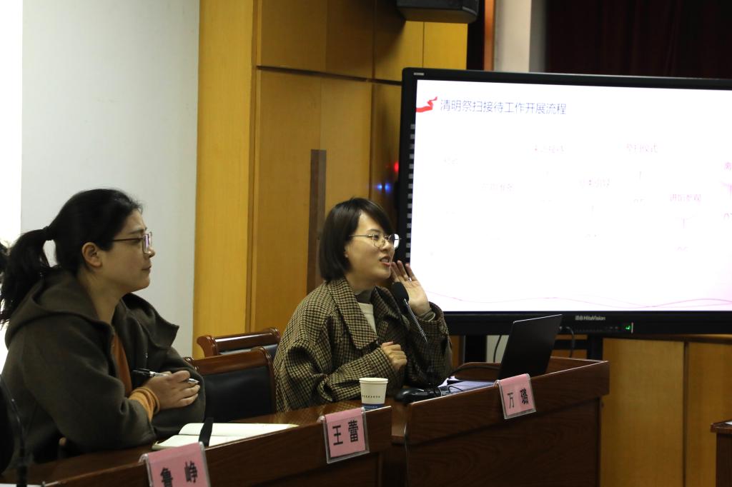 万主任细致讲解了“预约-前期准备-来访接待-分类引导-祭扫仪式-进馆参观-离馆”清明祭扫接待工作的七项基本流程,明确志愿服务活动的一日安排,同时对接待、音控、主持、宣讲四类志愿者的具体岗位职责分别做了详细的介绍,并着重强调了烈士陵园工作的纪律要求。