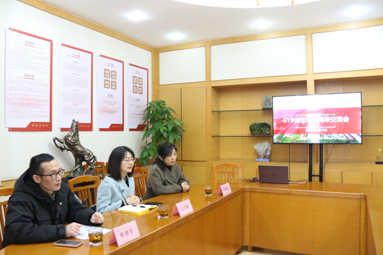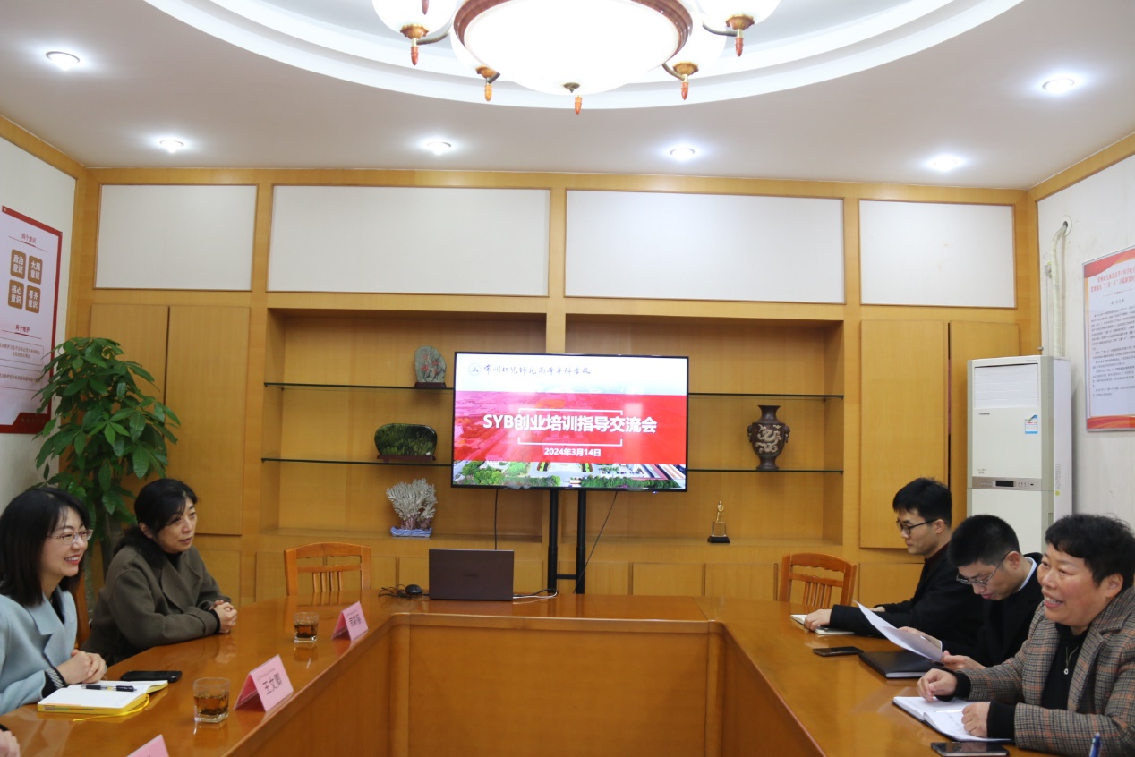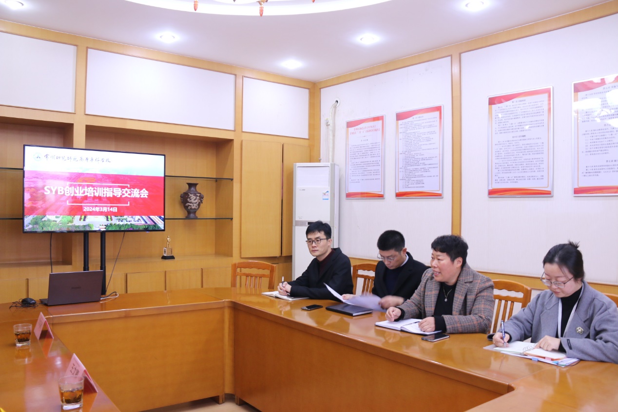 魏霞副校长对到访的各位领导表示热烈欢迎,并介绍了学校的基本情况。王文卿科长介绍了常州市就业创业工作的最新安排以及SYB培训项目的重要性。朱镇京科长针对具体操作流程进行了业务指导,为我校组建SYB培训班提供了实用的技能和经验。