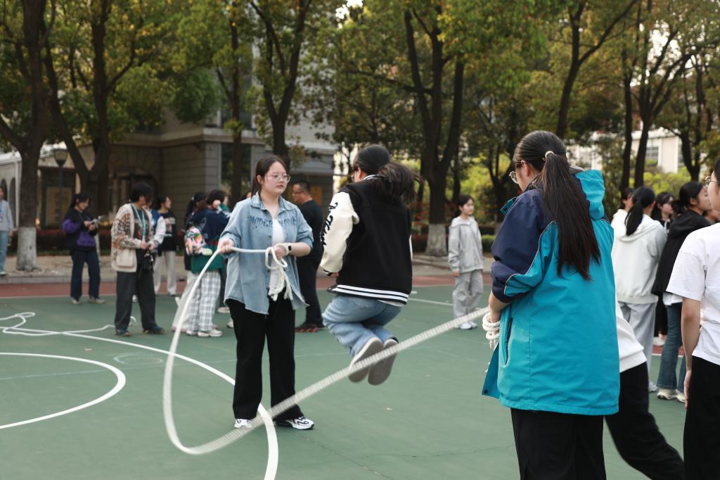 比赛共设置了绕“∞”跳长绳、双摇跳、踢毽(盘踢)三个项目。温暖灿烂的春日下,同学们充分展示了他们的技巧和实力。跳绳比赛中,绳子在同学们的手中前后翻飞,速度快如闪电。踢毽比赛极具观赏性,五彩的毽子在空中上下飞舞,仿佛一朵朵盛开的花朵。集体项目绕“∞”长绳更是紧张刺激,选手们如同轻盈的蝴蝶,快速地在长绳上穿梭跳跃。常幼专的操场上持续回响运动的旋律,青春的汗水在肆意挥洒。在比赛中,同学们不仅挑战了自我,还增进了彼此之间的友谊,培养了团队合作精神。