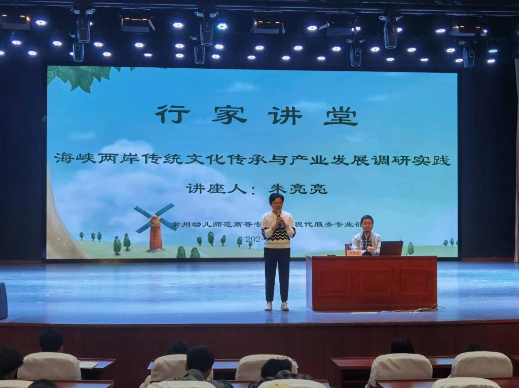 4月11日下午,现代服务专业部在仁艺楼演播厅举行《海峡两岸传统文化传承与产业发展调研实践》专题讲座,江苏理工学院艺术设计学院副院长朱亮亮教授受邀主讲,现代服务专业部全体同学及学前22、23级三年制所有同学参加。