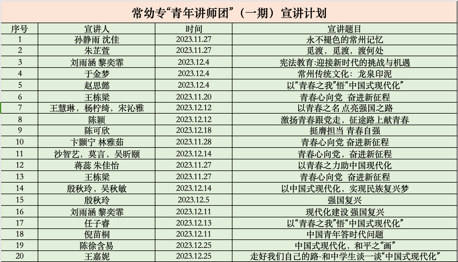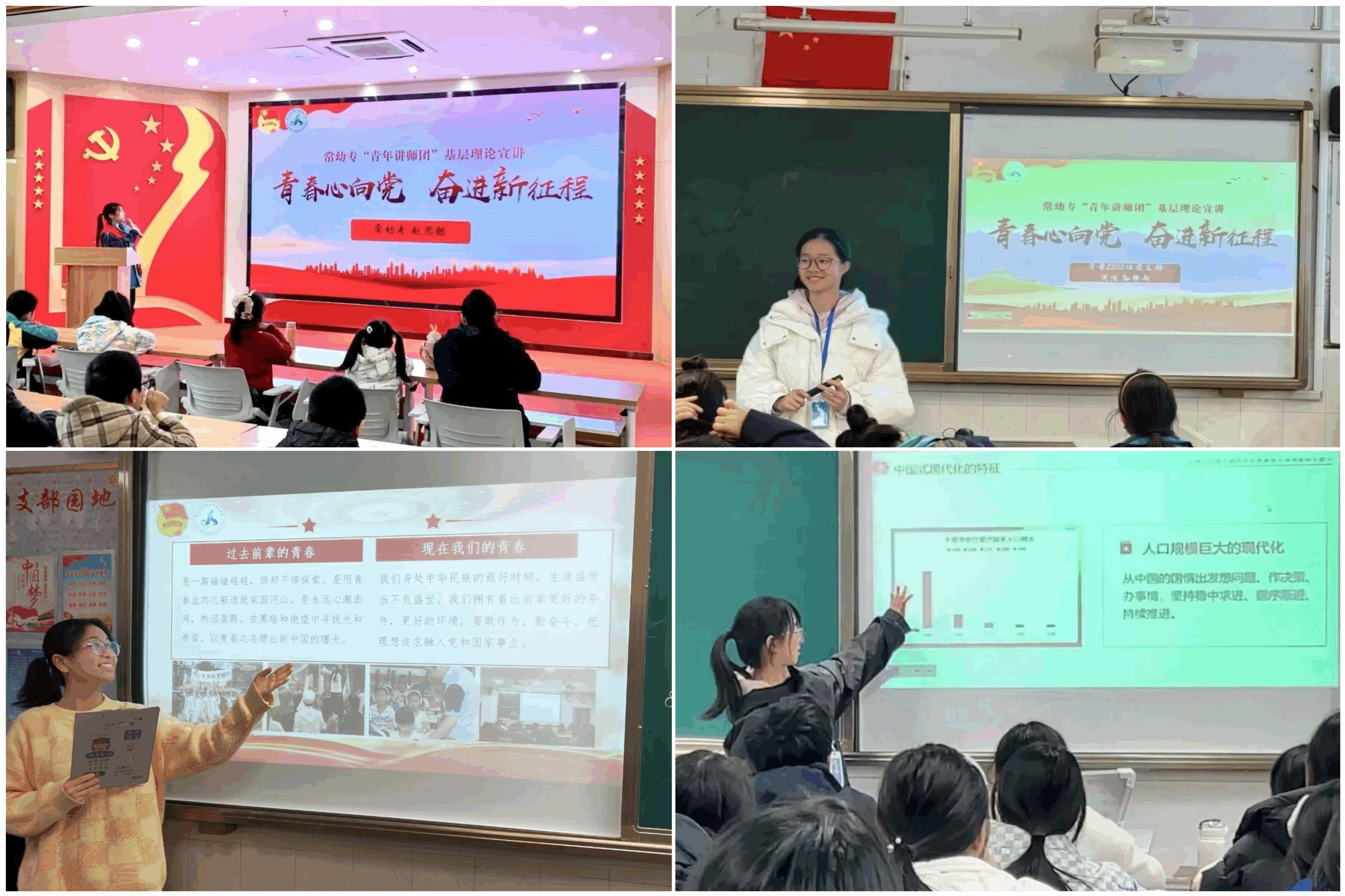 青年理论宣讲是传播党的创新理论、做好青年理论引领工作、创新式打造思想政治教育阵地的重要突破口。“青年讲师团”的培育与实践旨在引领我校青年学子用创新手段和“00后”的话语体系,以青年人的视角,用大家听得懂、学得会的语言将党的创新理论讲给更多的人听。2023年11月-12月,常幼专青年讲师团(一期)成立,一期成员围绕“青春心向党 奋进新征程”的主题,以个人或者“小分队”形式走进班级团支部、乡镇街道、附属幼儿园团支部,开展小规模、互动式基层宣讲,每场覆盖30-50人,共计开展二十余场,取得一定的成效。