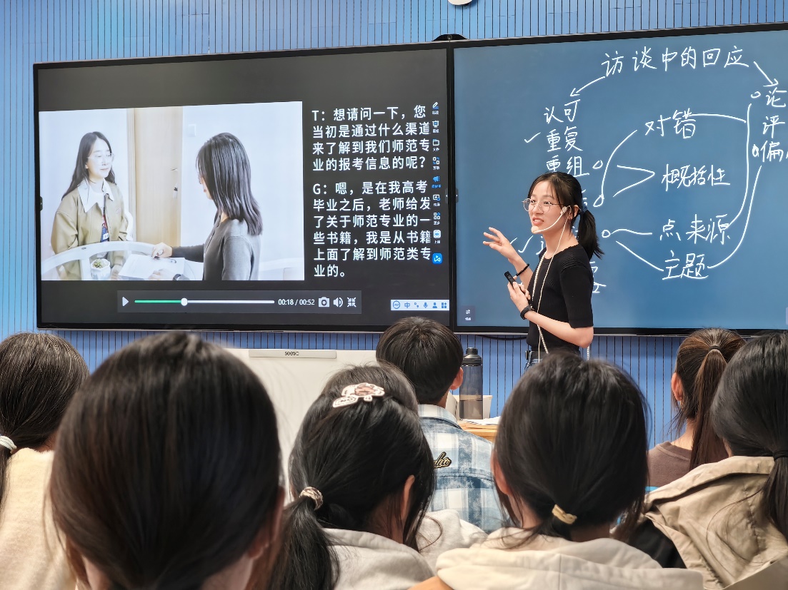 4月25日,学前教研室汤文佳老师开设了课题为《访谈中回应的技术与误区》的展示活动。汤老师采取学用结合的教学模式,通过生动的案例和深入浅出的讲解了“回应的技术与功能”、“回应的误入与风险”、“回应技术应用要点”等内容,帮助学生对教育科研方法中的访谈法有了更深刻的理解。同时,她还引导学生将研究中“开放包容”、“真诚尊重”等良好精神迁移到日常谈话中,将课程思政有效融入课堂教学。