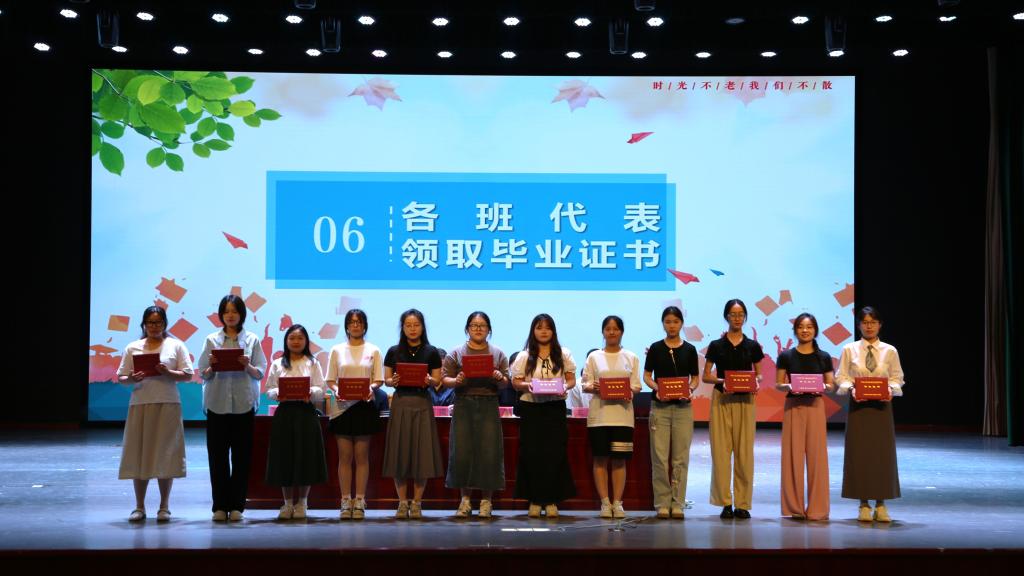 在激情澎湃的校歌声中,学生代表上台领取毕业证书。