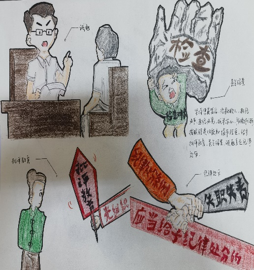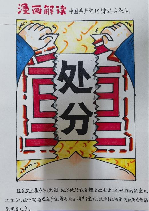 为了强化党员教师和学生入党、入团积极分子及学生干部的的纪律意识,使党纪学习更具吸引力和可感知性,提升学习效果和参与度,同时借助新媒体与传统宣传相结合的方式,拓展党建教育的创新形式,推动党建工作向更加立体化、多样化方向发展,我校第三支部委员会于2024年6月3日至6月24日开展了以“党纪在我心中"为主题的漫画设计活动,面向全校学生征集创意作品42幅。支部委员会邀请校内专业教师担任评委,共评出一等奖2名,二等奖3名,三等奖5名。现将评选结果和优秀作品公示如下: