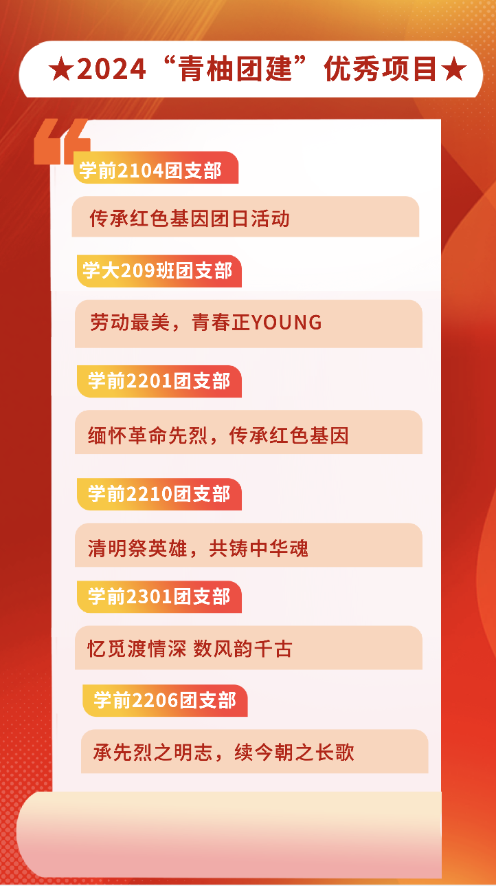 为进一步激发基层团组织活力,持续引导广大团员青年深入学习贯彻习近平新时代中国特色社会主义思想,矢志奋斗、青春建功,展现常幼青年的青春风采,本学期初,学校团委面向各班级团支部开展2024年度“青柚团建”主题团日活动征集工作。