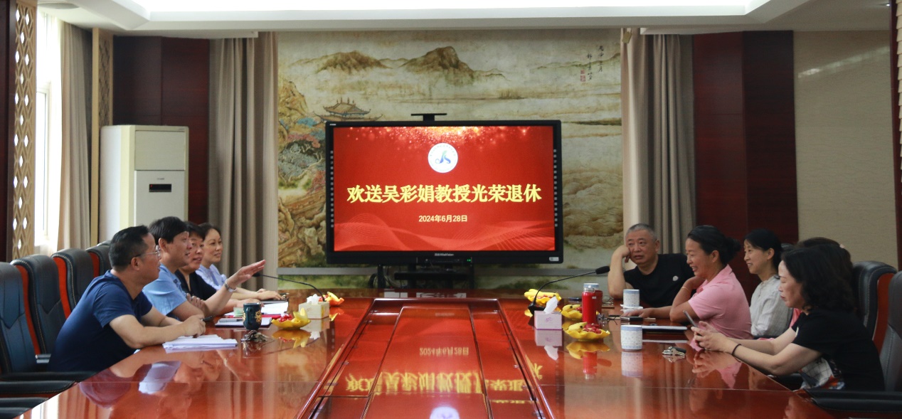 首先,魏霞副校长介绍吴彩娟教授的工作经历,大家一起回忆起与吴彩娟教授共同相处的工作点滴,大家一致认为吴教授不仅以诚挚之心待人,而且有着严谨负责、勇于担当的工作精神,犹如璀璨星辰,照亮了教育之路,令人钦佩不已。言谈之中,满载着对吴教授的深切眷恋与美好祈愿,愿其退休生涯健康喜乐,幸福绵长。