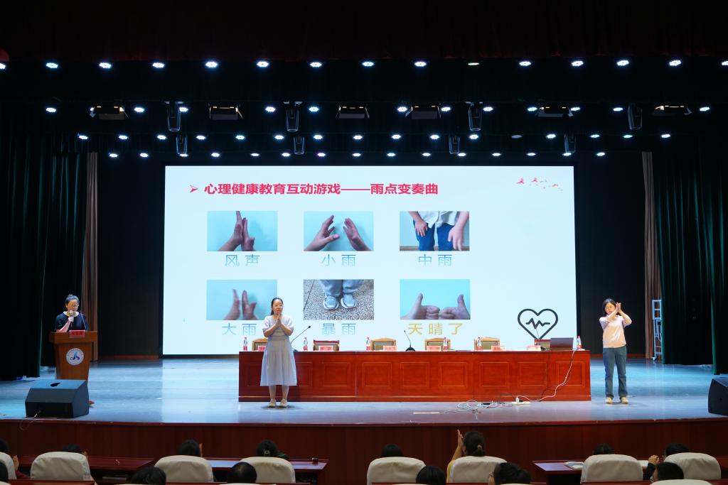 典礼开始前,校心理咨询室的三位老师带来一场别开生面的心理健康教育活动。在互动小游戏《雨点变奏曲》中,同学们跟着老师的指导与节奏,逐步舒缓心情,活跃开场氛围。