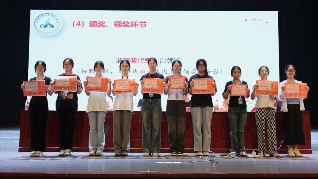 顾静处长宣读班风考核优秀班级和平行班考核情况。吴科岭主任宣读文明宿舍名单。吴盼盼副主任宣读先进班集体名单和雷锋班级名单。获奖班级依次上台领奖、合影。