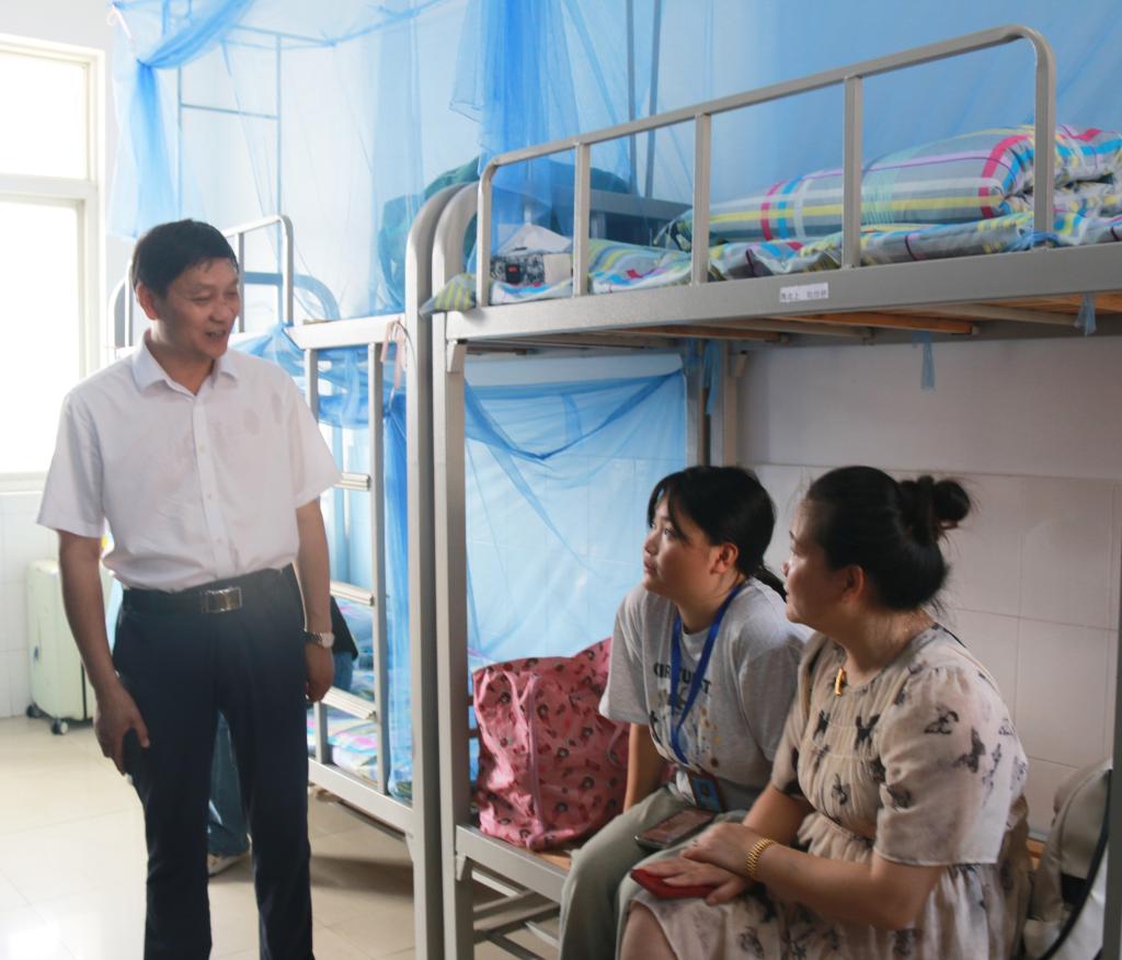 校党委书记、校长肖加平亲临报到现场,慰问、叮嘱参与迎新的师生注意防暑和休息。走访宿舍时,肖校长与家长亲切交谈,耐心地回应着家长的关切,深情的话语传达出对新生进德、修业的殷切期望。