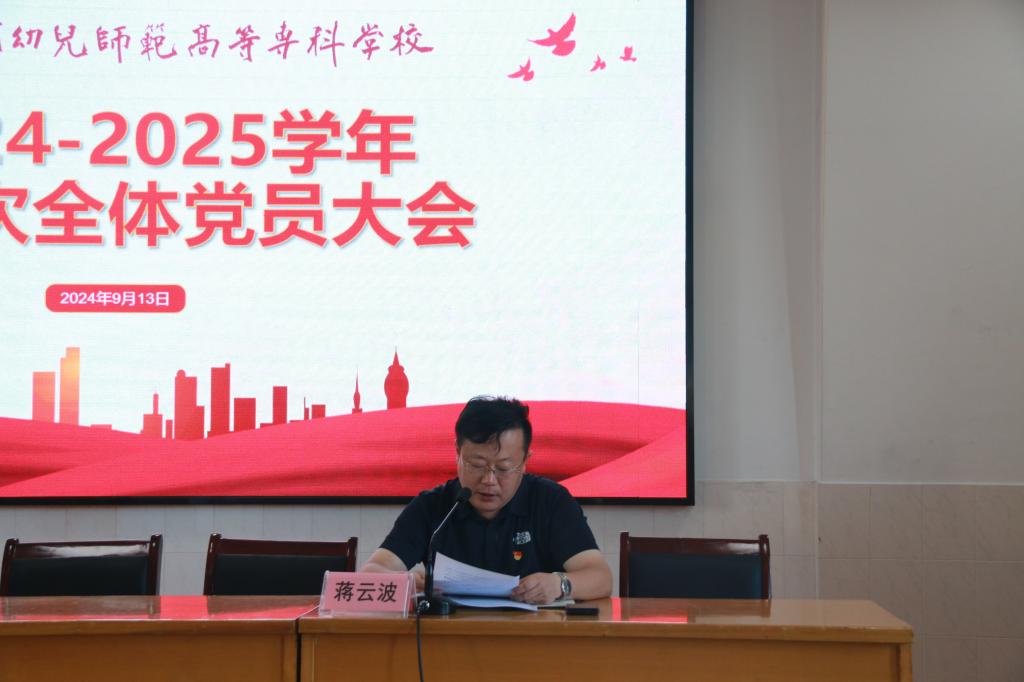 校党委副书记、副校长蒋云波同志对学校2024年上半年的党建工作进行了回顾和总结,对学校2024年下半年的党建重点工作做了部署和安排。新学期,我校将以推动学校党建高质量发展为主题,落实立德树人根本任务,加强教师队伍建设,大力弘扬践行教育家精神,落实支部党建工作责任制,深化支部品牌建设,进一步推进学校党建工作全面提质增效,为推动学校各项事业高质量发展提供坚强保证。