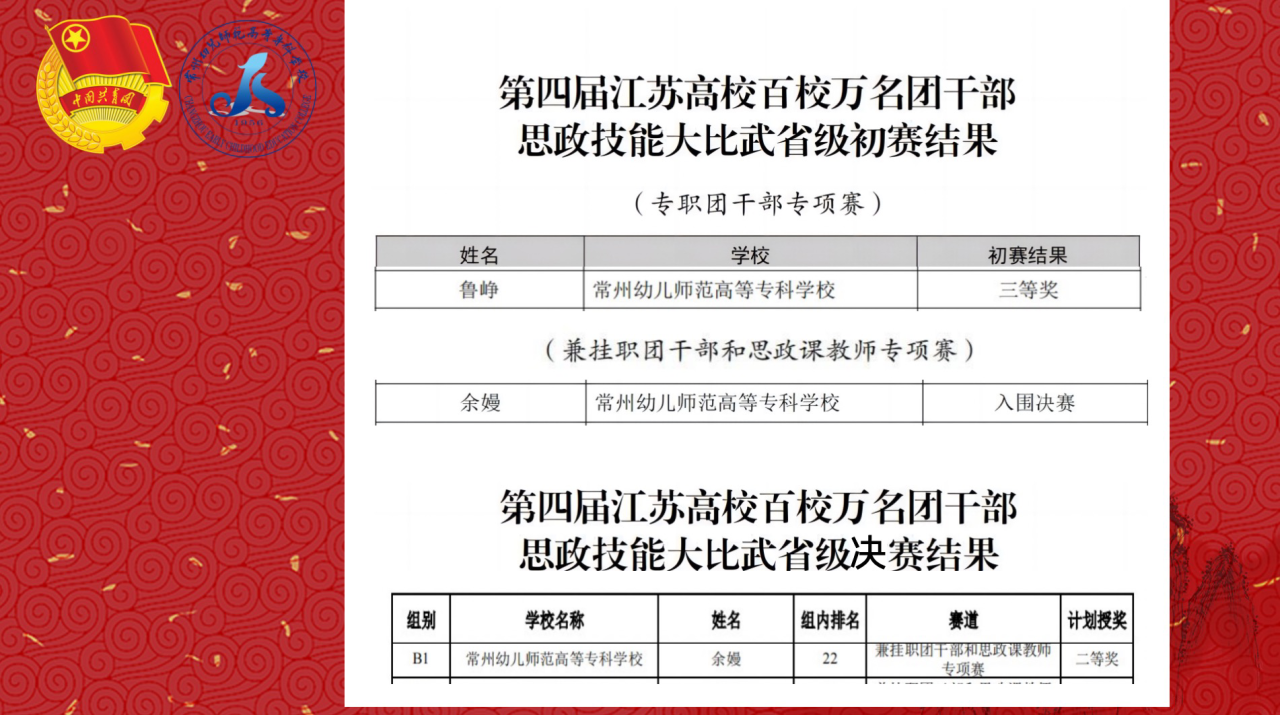 9月20日,第四届江苏高校百校万名团干部思政技能大比武初赛结果公布,我校余嫚老师从全省171所高校、万余名团干部中脱颖而出进入省决赛,鲁峥老师荣获江苏省专职团干部专项赛三等奖。9月29日,大比武决赛在南京举行,余嫚老师荣获江苏省兼挂职团干部专项赛二等奖。