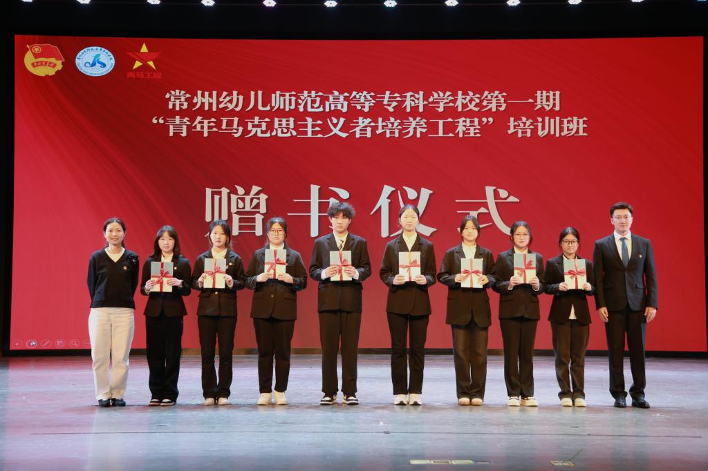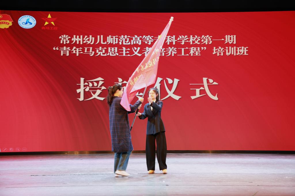 公共基础部(思政部)主任助理耿旭兰、第一期青马班班主任沈江涛老师为学员代表们赠送学习书籍。学工处处长王蕾为第一期“青马工程”培训班授旗。