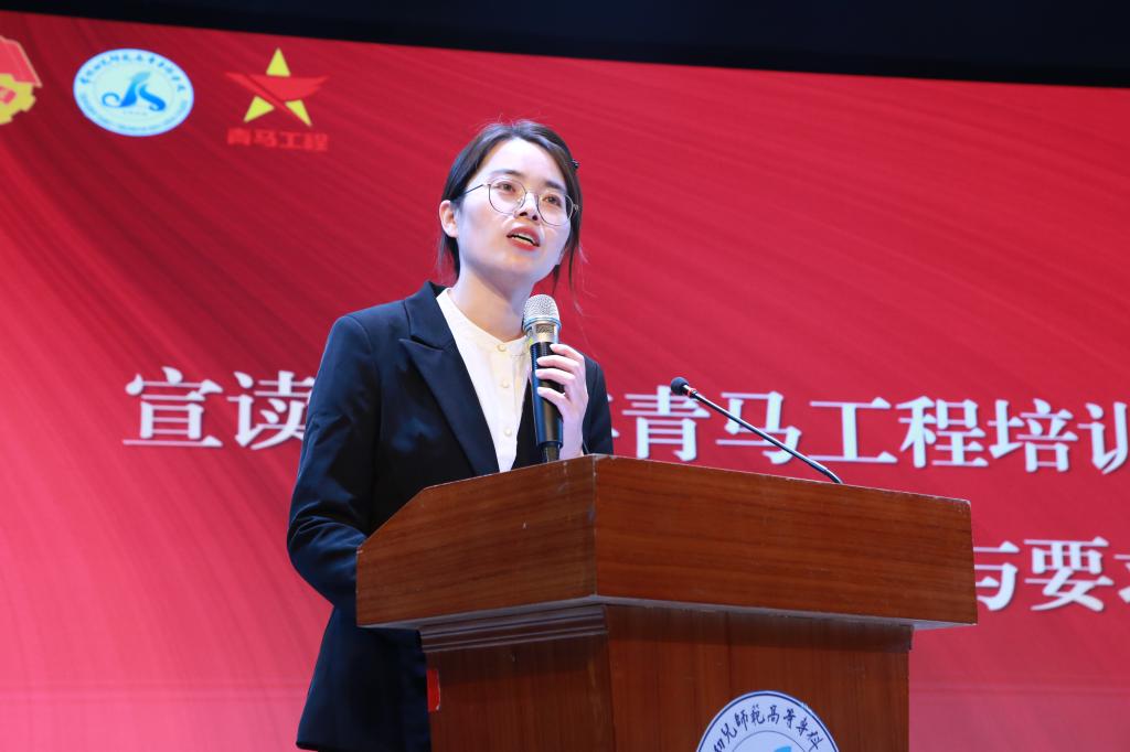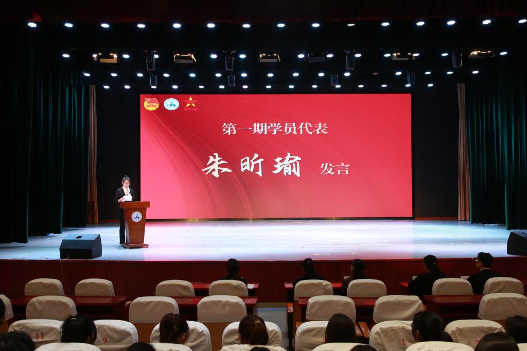 学员代表朱昕瑜上台发言。她表示,能够成为学校首期“青马工程”培训班中的一员,既感到无比荣幸,又深知责任重大。学员们会更加珍惜这次难得的学习机会,用马克思主义中国化最新成果武装头脑,坚定理想信念,锤炼作风,不负韶光,不负所托,向优秀迈进,争做社会主义合格接班人。
