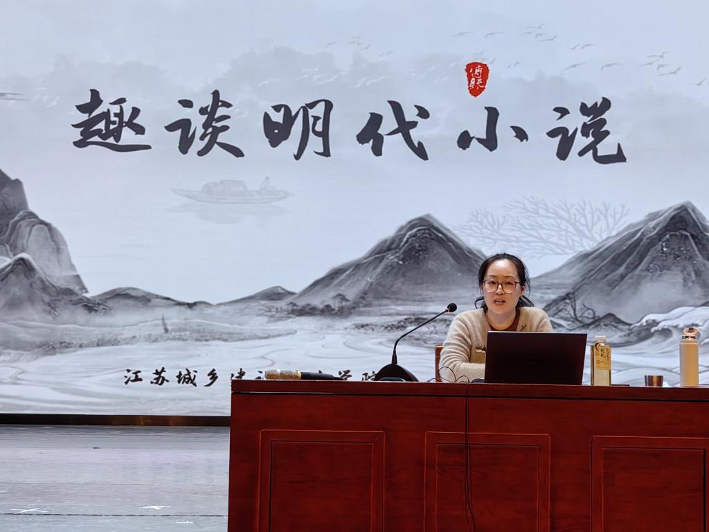 为提升学生的人文素养,开拓知识视野,11月12日下午,我校邀请了江苏城乡建设职业学院文史专任教师、常州市“优秀班主任”丁赟副教授,在演播厅开展了题为《趣谈明代小说》的讲座。讲座由公共基础部(思政部)耿旭兰老师主持,教务处副处长殷荣荣出席,我校23级、24级全体学生参加。
