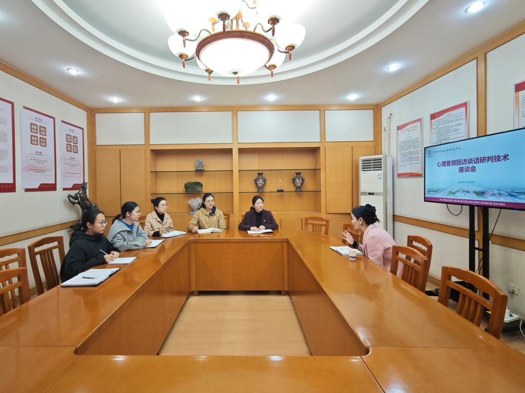 下午,普测回访谈话研判技术座谈会在第一会议室举行。彭老师与李娜副校长、王蕾处长、高柳莺副处长以及各位心理辅导员交流了学生心理普测后的回访工作、谈话研判技术的原则和相关注意事项,针对辅导员的工作难点给予建议。她鼓励辅导员们为自己工作减压,切实加强师生感情联结,保持跟踪关注,用灵活的方法和“适恰”的爱打开工作通道。