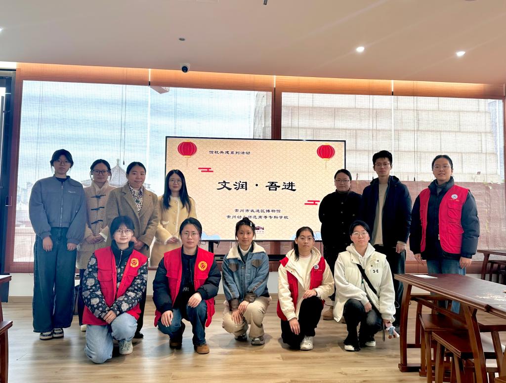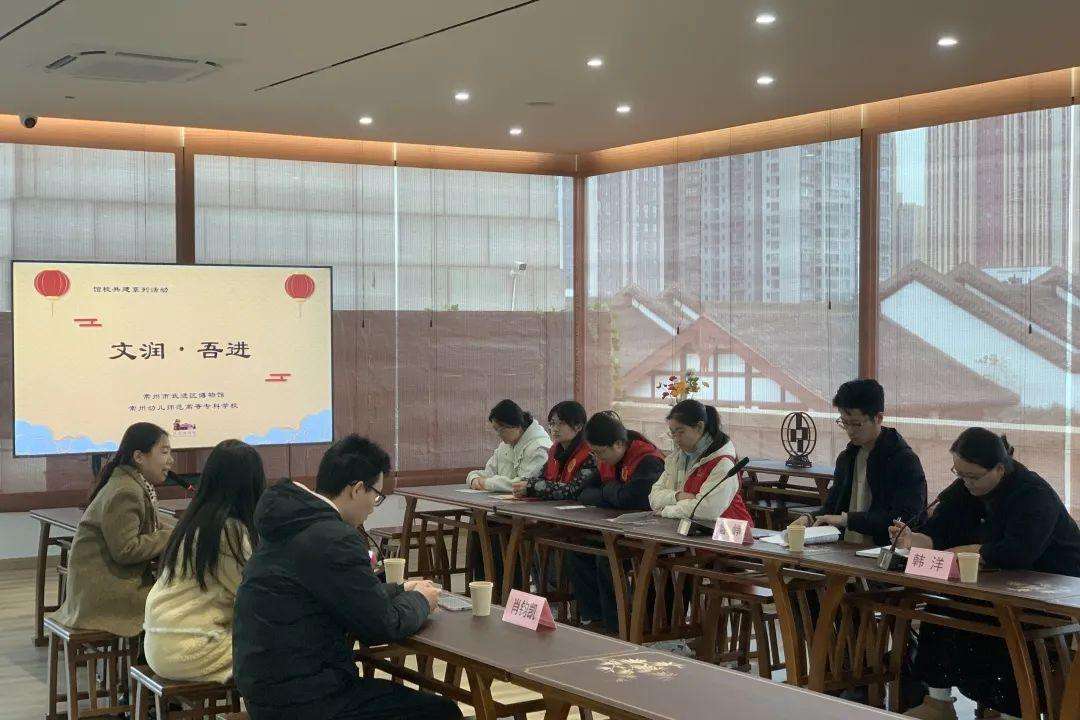 为探索馆校共建新模式,推进青年学习社建设,推动我校团员青年投身志愿服务,在“12.5国际志愿者日”来临之际,我校与武进博物馆联合召开“文润·吾进”青年学习社项目交流会。武进区文体广旅局团委书记周玉佳、副书记肖钧凯,武进博物馆公共服务部副主任孙斌,我校团委书记鲁峥,师范教育专业部韩洋老师及8名“小青柚”志愿者代表参加。