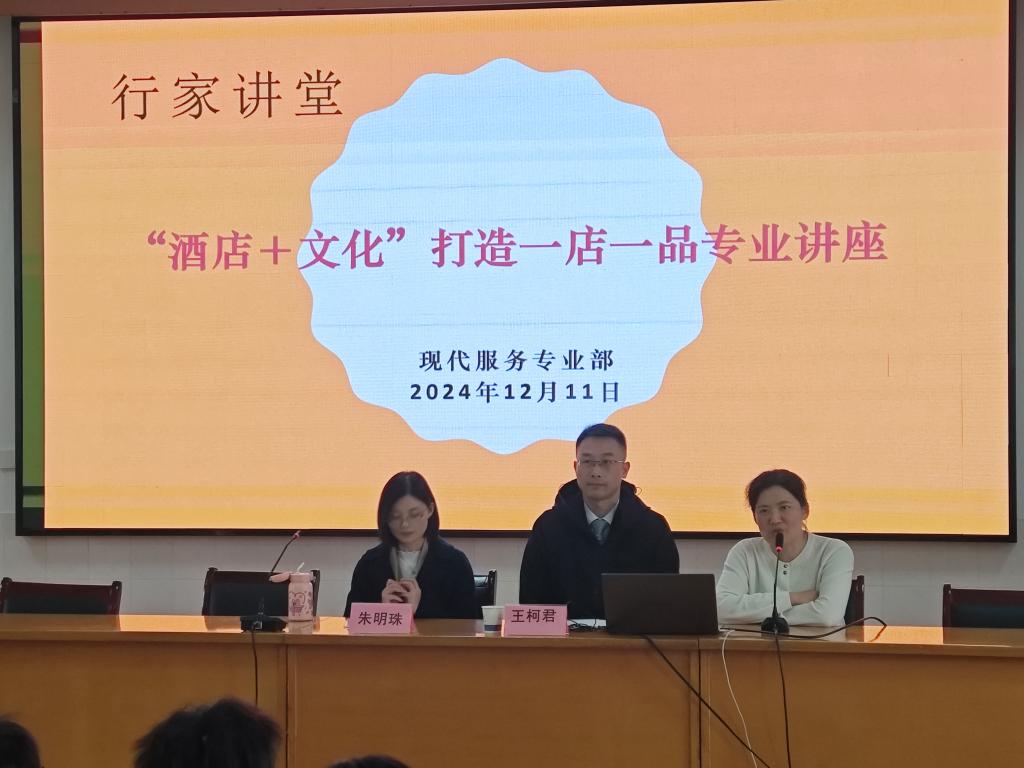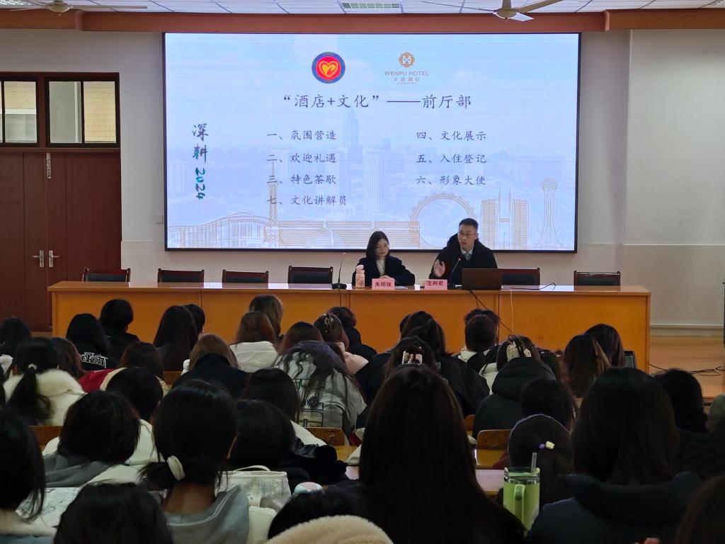12月11日,我校在5503教室举行以“‘酒店+文化’打造一店一品”为题的行家讲座。文璞酒店人力资源部总监王柯君、执行总经理朱明珠主讲,介绍了文化元素融入酒店管理的路径,分享了打造独一无二品牌形象的宝贵经验。旅游管理专业全体学生参加。
