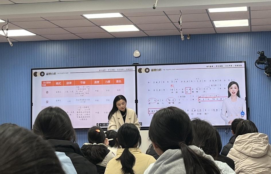 赵亚男老师在音乐鉴赏课上,以著名歌曲《教我如何不想她》为素材,采用AI数字技术,在“综合音乐感”教学理念下,带领学生感受歌曲中的不同音乐情绪,从多个角度进行分析鉴赏。赵老师将数字化教学与知识技能融合,引导学生热爱中国音乐,树立文化自信。