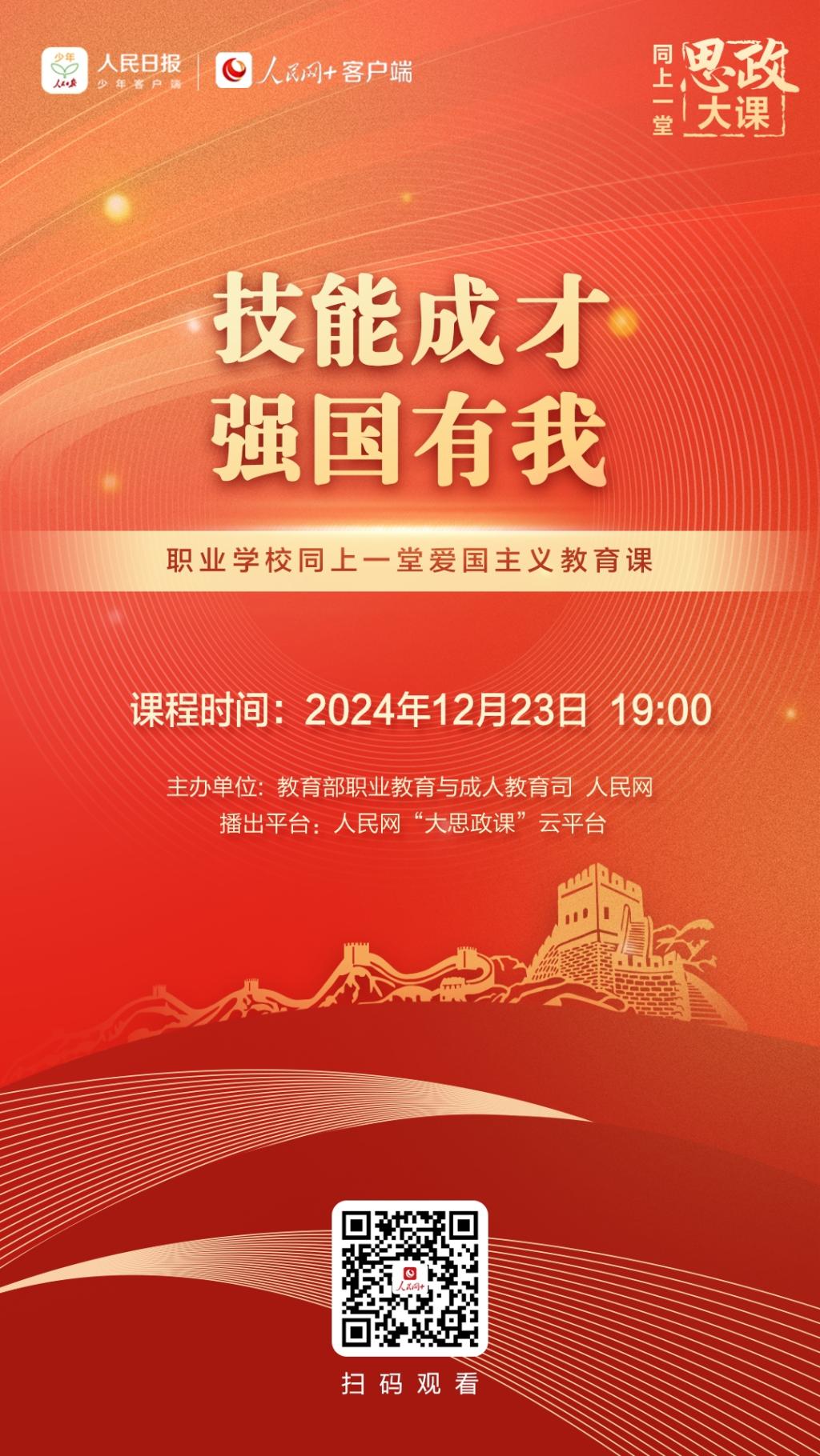 为深入开展爱国主义教育,培养职业学校学生的爱国情怀与责任担当,12月23日晚上,教育部职业教育与成人教育司会同人民网制作的职业学校“同上一堂爱国教育课”直播,我校全体学生在线观看,共同聆听一代代职教师生根植于心、实践于行的技能报国故事。