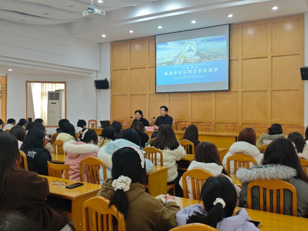 史院长从宏观政策切入,认为旅游业正逢前所未有的机遇,有着广阔的发展空间。他指出,优秀导游需具备扎实专业素养,明确职业理想与人生追求,拥有广博知识、出色沟通能力和责任心,要成为游客的文化引路人和知识传播者。史院长勉励同学们树立终身学习理念,汲取新知识,掌握新技能,提升专业素养和综合素质,以适应行业发展。他希望同学们珍惜在校时光,为职业生涯奠基。