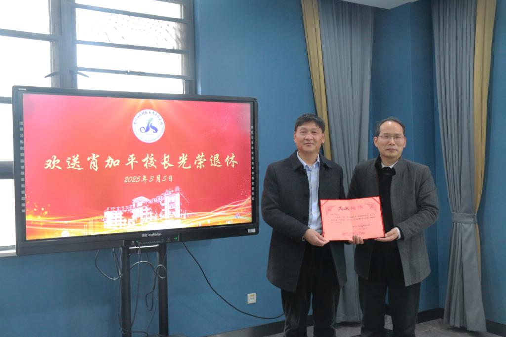 校党委书记、校长王中为肖校长颁发了光荣退休证书,并送上祝福。肖校长表达了对教育事业的热爱之情,展现了对学校、同事、学生的感激之心,并表示退休后将一如既往地关心和支持学校的发展。