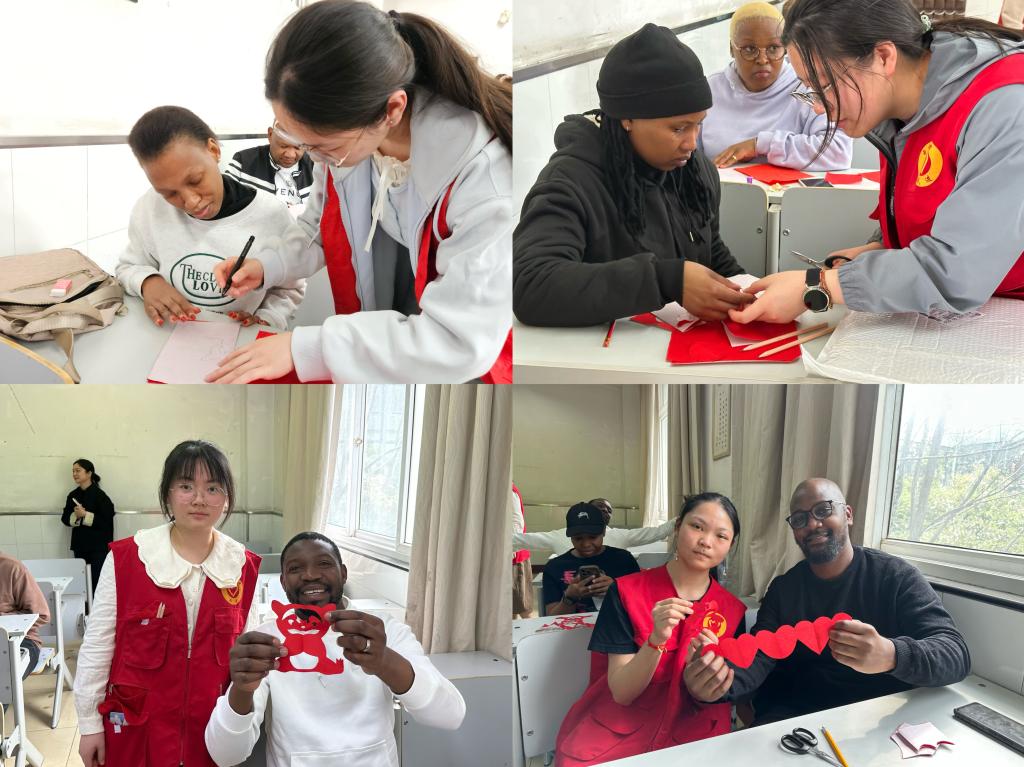 在讲解环节,我校志愿者介绍了中国剪纸艺术的千年历史与文化内涵。从“福”字纹样到生肖图腾,从红色窗花到现代创意设计,剪纸承载的吉祥寓意与艺术智慧深深吸引了在场外宾的目光。在实践环节,我校志愿者化身“非遗小导师”,一对一指导南非代表开展折纸、画稿、裁剪等实践活动,他们在反复尝试中逐渐掌握技巧,最终完成了“大熊猫”“爱心”等主题作品。活动现场欢声笑语,剪纸艺术跨越语言与国界,成为联结两国青年的纽带。