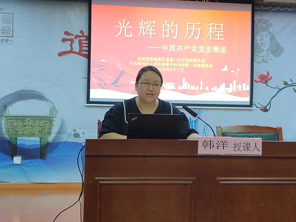 4月17日晚,我校第一党支部走进武进国家高新区喜盈门社区居民委员会,开展了一堂别开生面的党史党课。韩洋老师以“光辉的历程”为主题开展讲座,用鲜活的案例为30余位社区党员群众打开了百年党史的红色画卷。