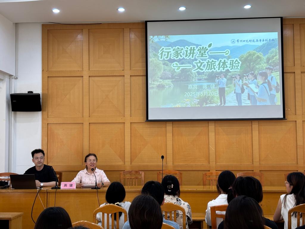 5月20日,溧阳中等专业学校旅游教研室主任,常州市职业技能标兵,江苏省职业院校技能大赛金牌获得者蒋健做客我校“行家讲堂”,为旅游管理专业全体师生带来一场题为“文旅体验”的精彩专题讲座。活动由专业负责人庄东芳老师主持。