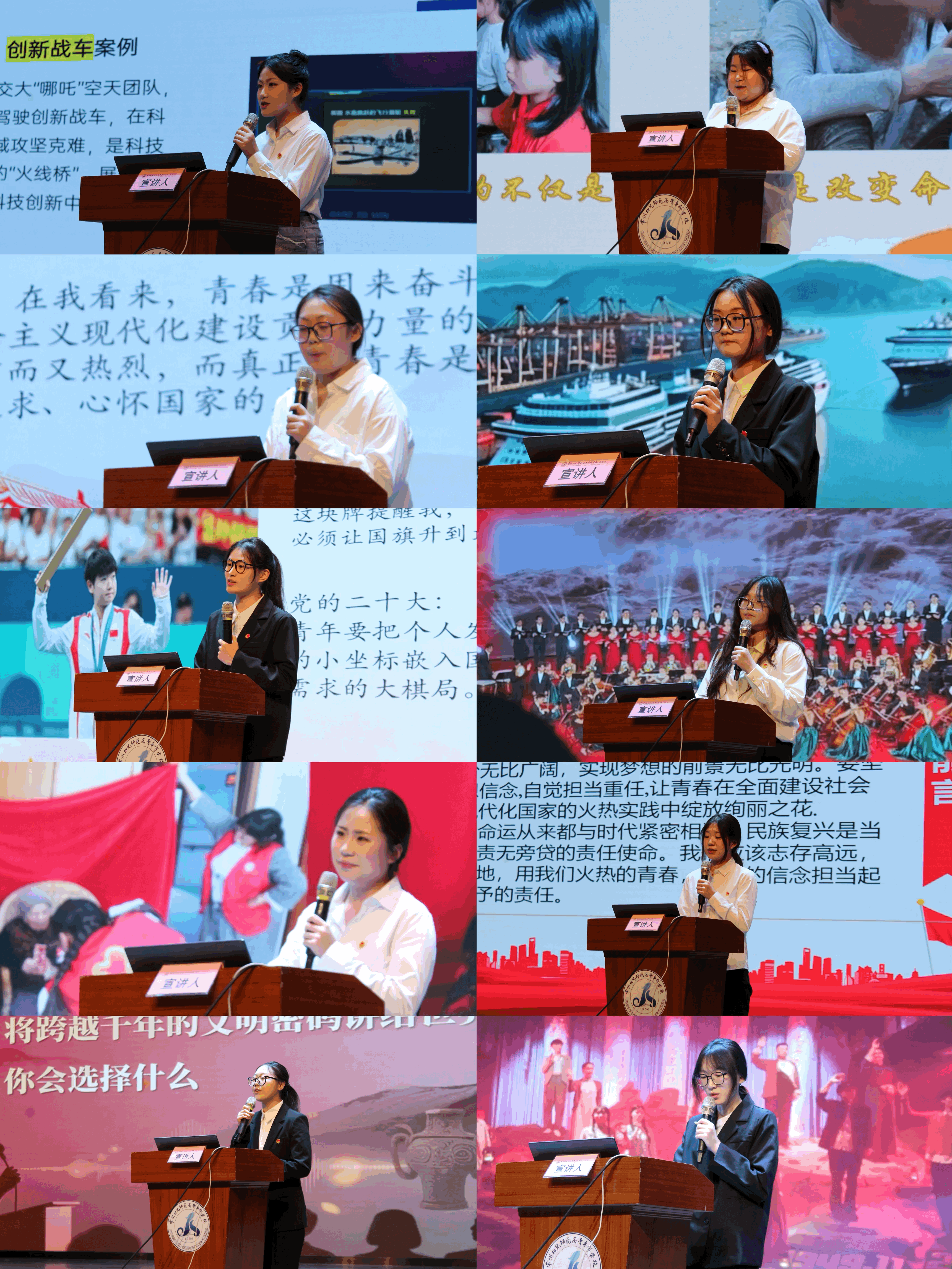 比赛过程中,10位选手紧紧围绕时代脉搏,立足青年视角,创新诠释思政内涵,充分展现了我校学子深厚的思想素养与强大的行动力。夏添同学以沂蒙“小推车”为切口,将话题延伸至“青春车”,以青年之声积极回应时代命题;何欣妍同学围绕“青春为何,青年何为”主题,号召广大青年投身国家建设;朱昕瑜同学借助“球”这一符号,巧妙衔接赛场与课堂,传递青春使命;邱福娣同学通过镜头传递温暖,坚定践行青年初心;高小雨同学以声音为笔,传承中华千年文脉,讲述好中华故事;卢婷婷同学以丰富知识诠释温情,用实际行动激发希望;汤佳鑫同学号召弘扬丝路精神,凝聚青年力量共筑时代新篇;季文珺同学以红岩精神铸就青春光辉;王昱辰同学通过展示艺术作品,诠释红色记忆的当代联结;周梦洁同学立足“生逢盛世,青年有为”,从自身出发,表达青年投身时代建设的责任担当。