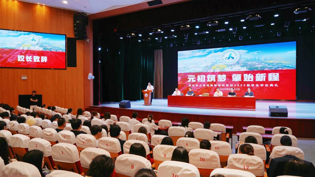 校党委书记、校长王中发表了饱含深情的毕业寄语。他动情回顾道:“作为首届三年制毕业生,同学们以开拓者之姿为母校谱写了华彩篇章——77名学前教育专业学子以仁爱之心深耕幼教沃土,38名艺术设计专业学子以创新之笔勾勒青春画卷。更令人自豪的是,45名学子通过专转本考试,成功考入常州大学、盐城师范学院等本科院校,实现了从专科生到本科生的华丽蜕变。”面对即将踏上新征程的毕业生,王校长勉励大家以奋斗为笔,以担当为目,将个人理想融入时代洪流,在各自领域绽放璀璨光芒。