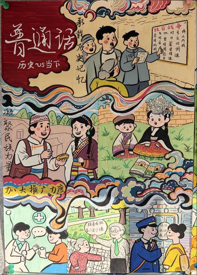 本次活动覆盖22级、23级、24级学生,设置三大特色板块:学生在“笔墨忆峥嵘”海报设计中,融合抗战元素与现代场景,以手绘形式展现语言与历史的联结;在“声传英雄事”诵读会中,通过诵读抗战家书、爱国诗词等经典,用声音传承红色基因;在“语述团结情”微视频创作中,记录了多民族互助、纪念馆讲解等场景,凸显语言对民族团结的促进作用。