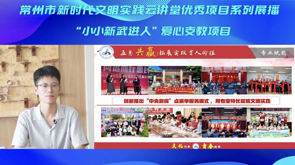 今年上半年,市文明办面向全市新时代文明实践中心所(站)、公益社会组织、高校和职业学校等,征集了116个申报项目,最终评选16个优秀项目纳入新时代文明实践中央厨房菜单。我校“小小新武进人”爱心支教项目成功入选,并于9月26日在“文明实践云讲堂”专题直播中亮相。